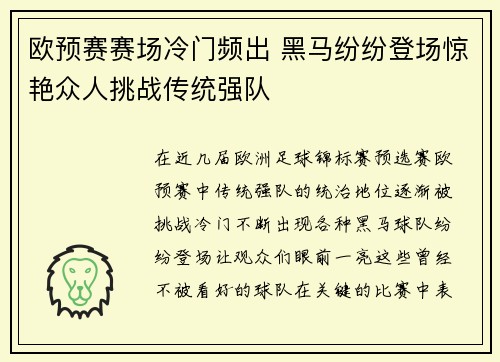 欧预赛常规赛激战正酣 强队争锋逐鹿赛场胜利之巅