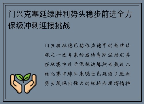 本文将从甘冈队与斯特拉斯堡队的比赛谈起,分析甘冈队如何力克对手,迎来一场关键胜利,并由此实现连胜势头。文章将从战术布置、球员表现、比赛中的关键时刻、以及赛后影响四个方面深入剖析比赛的细节与意义。这场胜利不仅让甘冈队保持了良好的状态,也为他们接下来的比赛奠定了信心基础。本文将对这些方面进行详细探讨,力图呈现一幅全面的比赛画面。1、战术布置的成功实施在与斯特拉斯堡的比赛中,甘冈队展现了出色的战术执行力...